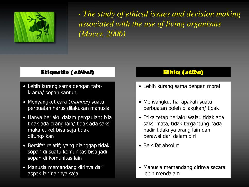 - The study of ethical issues and decision making associated with the use of living organisms (Macer, 2006) Etiquette (etiket) Ethics (etika) • Lebih kurang sama dengan tata-krama/ sopan santun • Menyangkut cara (manner) suatu perbuatan harus dilakukan manusia • Hanya berlaku dalam pergaulan; bila tidak ada orang lain/ tidak ada saksi maka etiket bisa saja tidak difungsikan • Bersifat relatif; yang dianggap tidak sopan di suatu komunitas bisa jadi sopan di komunitas lain • Manusia memandang dirinya dari aspek lahiriahnya saja • Lebih kurang sama dengan moral • Menyangkut hal apakah suatu perbuatan boleh dilakukan/ tidak • Etika tetap berlaku walau tidak ada saksi mata, tidak tergantung pada hadir tidaknya orang lain dan berawal dari dalam diri • Bersifat absolut • Manusia memandang dirinya secara lebih mendalam