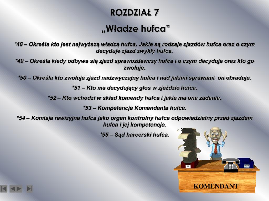 ROZDZIAŁ 7 „Władze hufca” *48 – Określa kto jest najwyższą władzą hufca. Jakie są rodzaje zjazdów hufca oraz o czym decyduje zjazd zwykły hufca. *49 – Określa kiedy odbywa się zjazd sprawozdawczy hufca i o czym decyduje oraz kto go zwołuje. *50 – Określa kto zwołuje zjazd nadzwyczajny hufca i nad jakimi sprawami on obraduje. *51 – Kto ma decydujący głos w zjeździe hufca. *52 – Kto wchodzi w skład komendy hufca i jakie ma ona zadania. *53 – Kompetencje Komendanta hufca. *54 – Komisja rewizyjna hufca jako organ kontrolny hufca odpowiedzialny przed zjazdem hufca i jej kompetencje. *55 – Sąd harcerski hufca. KOMENDANT