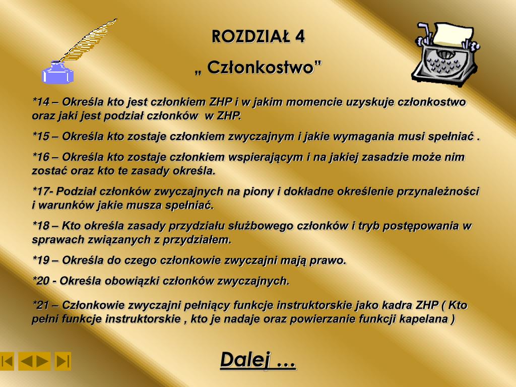ROZDZIAŁ 4 „ Członkostwo” *14 – Określa kto jest członkiem ZHP i w jakim momencie uzyskuje członkostwo oraz jaki jest podział członków w ZHP. *15 – Określa kto zostaje członkiem zwyczajnym i jakie wymagania musi spełniać . *16 – Określa kto zostaje członkiem wspierającym i na jakiej zasadzie może nim zostać oraz kto te zasady określa. *17- Podział członków zwyczajnych na piony i dokładne określenie przynależności i warunków jakie musza spełniać. *18 – Kto określa zasady przydziału służbowego członków i tryb postępowania w sprawach związanych z przydziałem. *19 – Określa do czego członkowie zwyczajni mają prawo. *20 - Określa obowiązki członków zwyczajnych. *21 – Członkowie zwyczajni pełniący funkcje instruktorskie jako kadra ZHP ( Kto pełni funkcje instruktorskie , kto je nadaje oraz powierzanie funkcji kapelana ) Dalej …