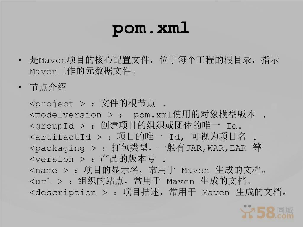 pom.xml • 是Maven项目的核心配置文件,位于每个工程的根目录,指示Maven工作的元数据文件。 • 节点介绍 <project > :文件的根节点 .<modelversion > : pom.xml使用的对象模型版本 .<groupId > :创建项目的组织或团体的唯一 Id.<artifactId > :项目的唯一 Id, 可视为项目名 .<packaging > :打包类型,一般有JAR,WAR,EAR 等 <version > :产品的版本号 .<name > :项目的显示名,常用于 Maven 生成的文档。 <url > :组织的站点,常用于 Maven 生成的文档。 <description > :项目描述,常用于 Maven 生成的文档。
