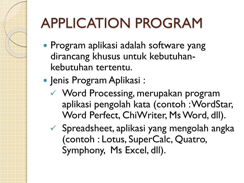 APPLICATION PROGRAM • Program aplikasiadalah software yang dirancangkhususuntukkebutuhan-kebutuhantertentu. • Jenis Program Aplikasi : • Word Processing, merupakan program aplikasipengolahkata(contoh : WordStar, Word Perfect, ChiWriter, Ms Word, dll). • Spreadsheet, aplikasi yang mengolahangka (contoh : Lotus, SuperCalc, Quatro, Symphony, Ms Excel, dll).