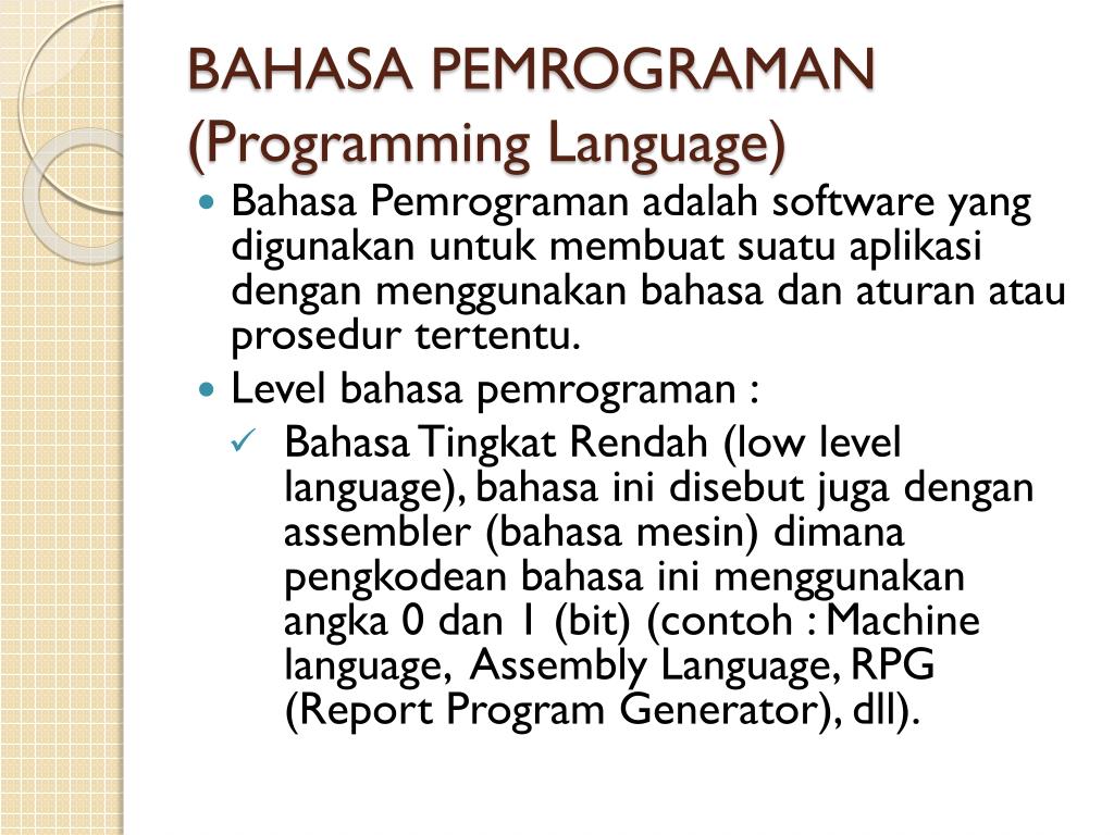 BAHASA PEMROGRAMAN (Programming Language) • BahasaPemrogramanadalah software yang digunakanuntukmembuatsuatuaplikasidenganmenggunakanbahasadanaturanatauprosedurtertentu. • Level bahasapemrograman : • Bahasa Tingkat Rendah (low level language), bahasainidisebutjugadengan assembler (bahasamesin) dimanapengkodeanbahasainimenggunakanangka 0 dan 1 (bit) (contoh : Machine language, Assembly Language, RPG (Report Program Generator), dll).
