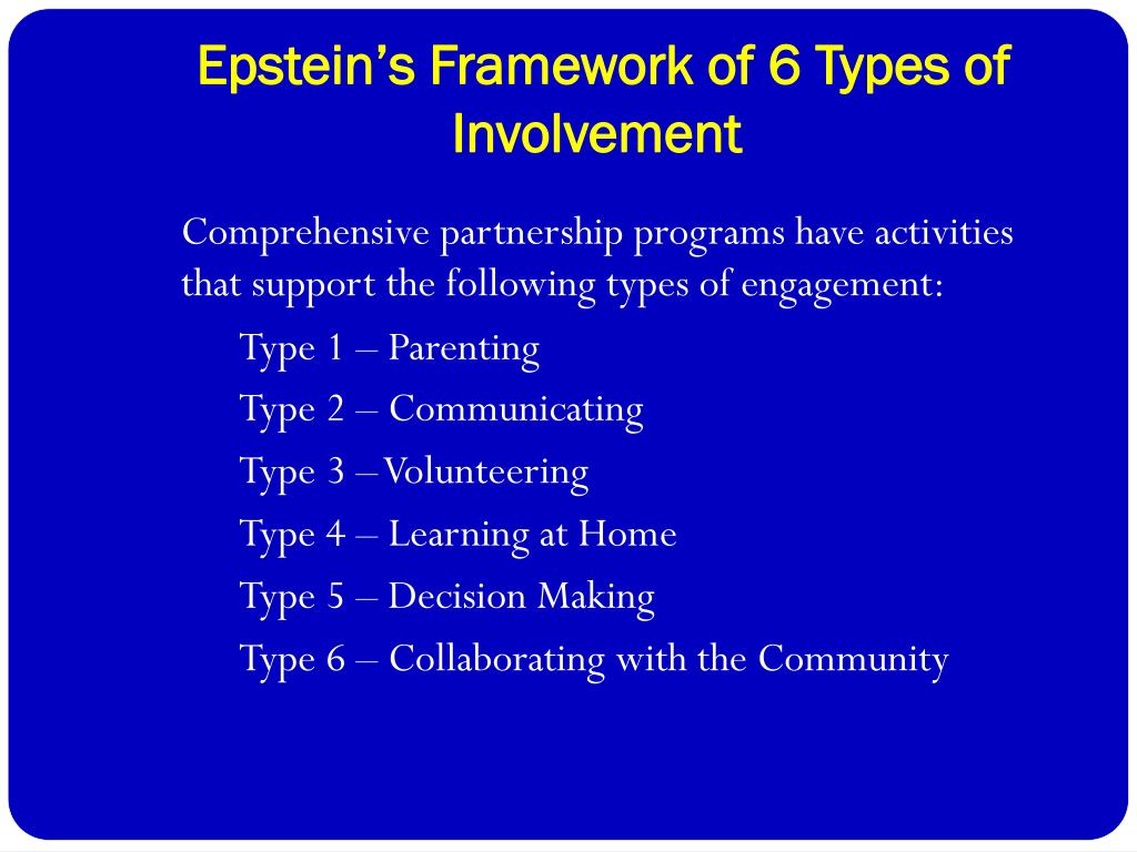 Epstein’s Framework of 6 Types of Involvement Comprehensive partnership programs have activities that support the following types of engagement: Type 1 – Parenting Type 2 – Communicating Type 3 – Volunteering Type 4 – Learning at Home Type 5 – Decision Making Type 6 – Collaborating with the Community