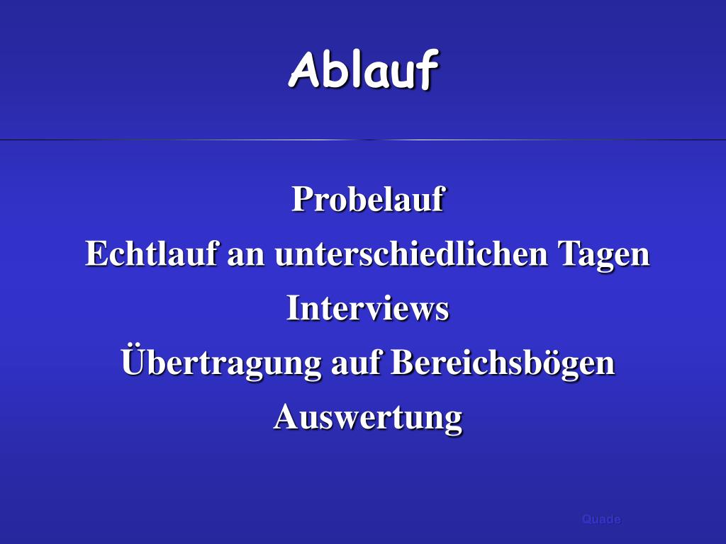 Ablauf Probelauf Echtlauf an unterschiedlichen Tagen Interviews Übertragung auf Bereichsbögen Auswertung Quade
