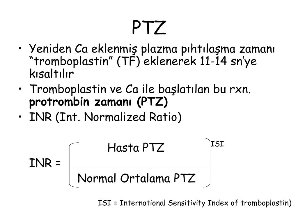PTZ • Yeniden Ca eklenmiş plazma pıhtılaşma zamanı “tromboplastin” (TF) eklenerek 11-14 sn’ye kısaltılır • Tromboplastin ve Ca ile başlatılan bu rxn. protrombin zamanı (PTZ) • INR (Int. Normalized Ratio) Hasta PTZ INR = Normal Ortalama PTZ ISI ISI = International Sensitivity Index of tromboplastin)
