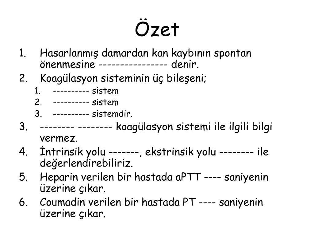 Özet • Hasarlanmış damardan kan kaybının spontan önenmesine ---------------- denir. • Koagülasyon sisteminin üç bileşeni; • ---------- sistem • ---------- sistem • ---------- sistemdir. • -------- -------- koagülasyon sistemi ile ilgili bilgi vermez. • İntrinsik yolu -------, ekstrinsik yolu -------- ile değerlendirebiliriz. • Heparin verilen bir hastada aPTT ---- saniyenin üzerine çıkar. • Coumadin verilen bir hastada PT ---- saniyenin üzerine çıkar.