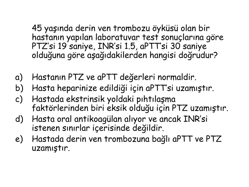 45 yaşında derin ven trombozu öyküsü olan bir hastanın yapılan laboratuvar test sonuçlarına göre PTZ’si 19 saniye, INR’si 1.5, aPTT’si 30 saniye olduğuna göre aşağıdakilerden hangisi doğrudur? • Hastanın PTZ ve aPTT değerleri normaldir. • Hasta heparinize edildiği için aPTT’si uzamıştır. • Hastada ekstrinsik yoldaki pıhtılaşma faktörlerinden biri eksik olduğu için PTZ uzamıştır. • Hasta oral antikoagülan alıyor ve ancak INR’si istenen sınırlar içerisinde değildir. • Hastada derin ven trombozuna bağlı aPTT ve PTZ uzamıştır.