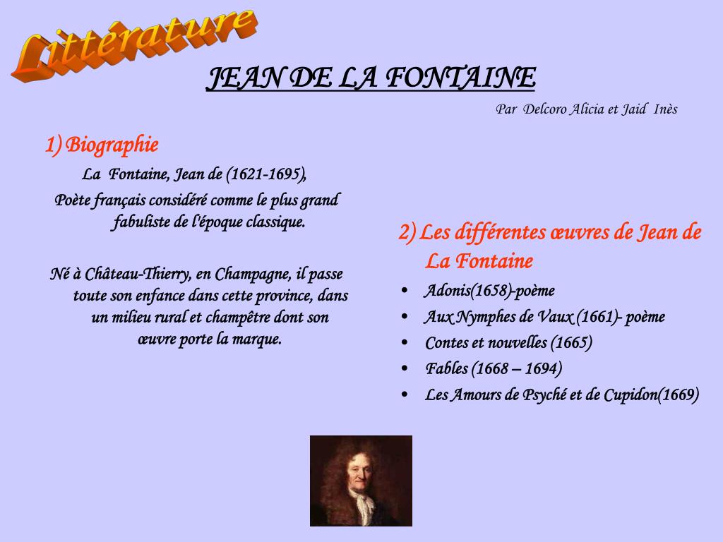 Littérature JEAN DE LA FONTAINEPar Delcoro Alicia et Jaid Inès 1) Biographie La Fontaine, Jean de (1621-1695), Poète français considéré comme le plus grand fabuliste de l'époque classique. Né à Château-Thierry, en Champagne, il passe toute son enfance dans cette province, dans un milieu rural et champêtre dont son œuvre porte la marque. 2) Les différentes œuvres de Jean de La Fontaine • Adonis(1658)-poème • Aux Nymphes de Vaux (1661)- poème • Contes et nouvelles (1665) • Fables (1668 – 1694) • Les Amours de Psyché et de Cupidon(1669)
