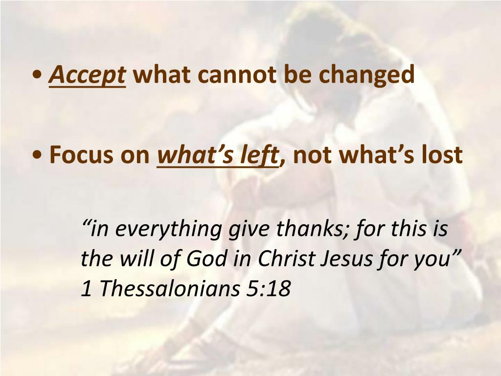 Accept what cannot be changed • Focus on what’s left, not what’s lost “in everything give thanks; for this is the will of God in Christ Jesus for you” 1 Thessalonians 5:18