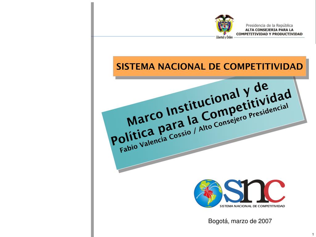 SISTEMA NACIONAL DE COMPETITIVIDAD Marco Institucional y de Política para la CompetitividadFabio Valencia Cossio / Alto Consejero Presidencial Bogotá, marzo de 2007