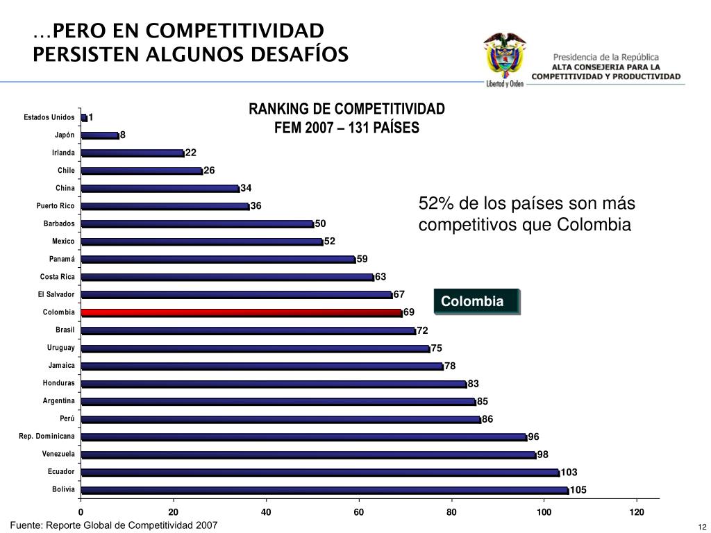 …PERO EN COMPETITIVIDAD PERSISTEN ALGUNOS DESAFÍOS RANKING DE COMPETITIVIDAD FEM 2007 – 131 PAÍSES 52% de los países son más competitivos que Colombia Colombia Fuente: Reporte Global de Competitividad 2007