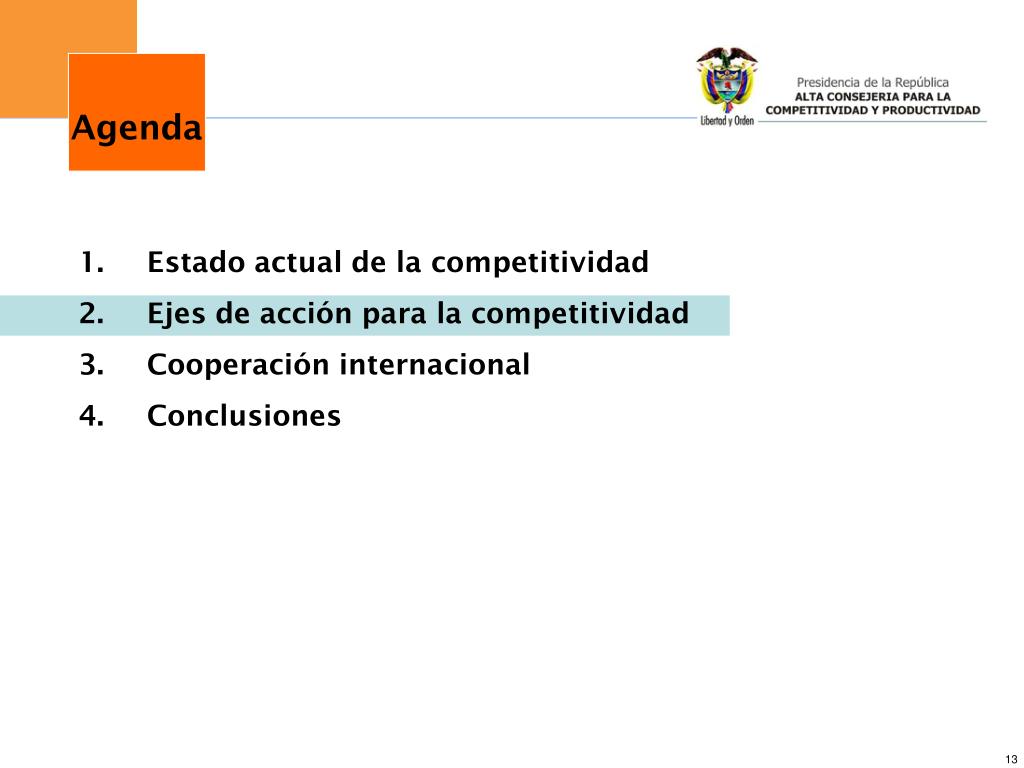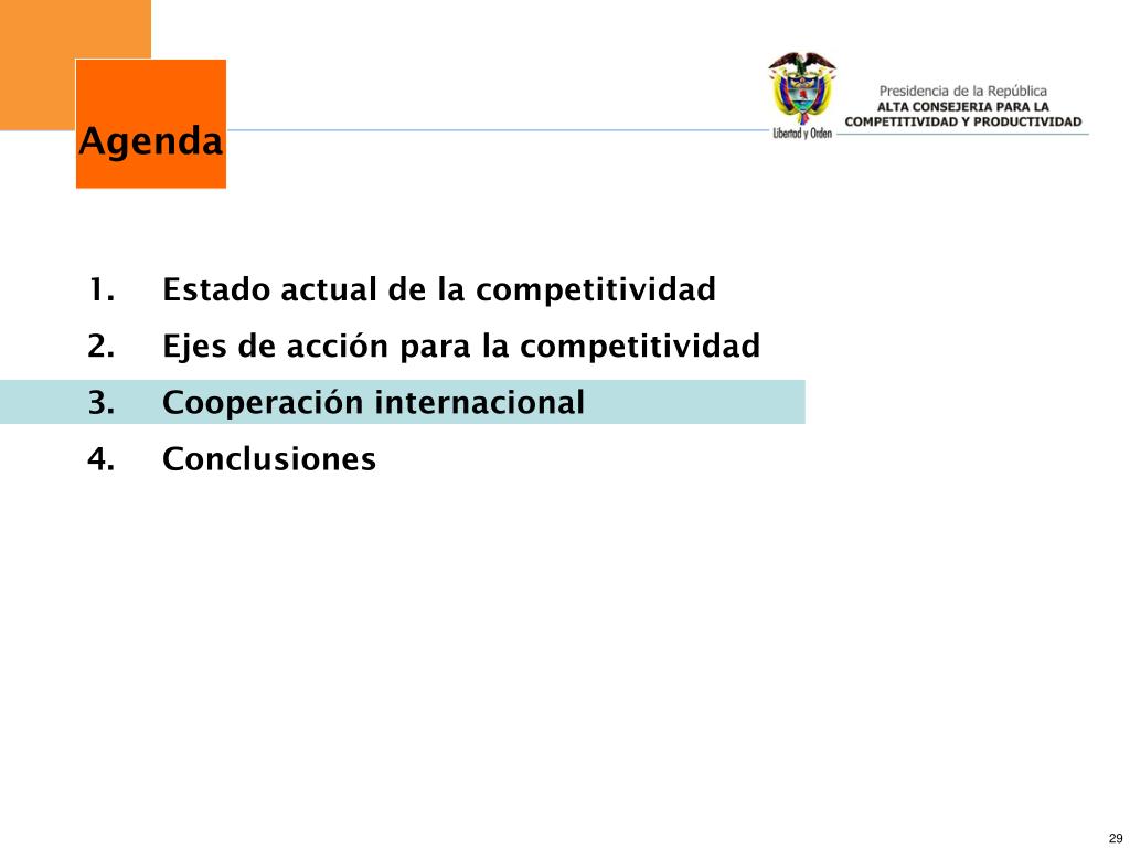 Agenda • Estado actual de la competitividad • Ejes de acción para la competitividad • Cooperación internacional • Conclusiones
