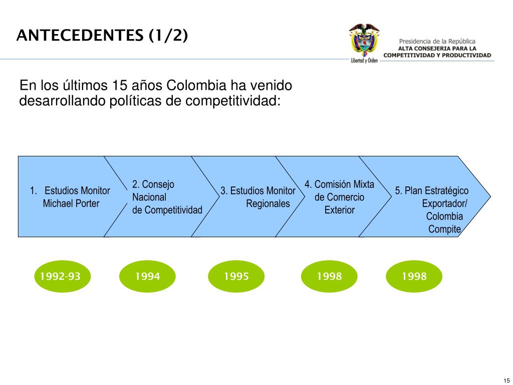 ANTECEDENTES (1/2) En los últimos 15 años Colombia ha venido desarrollando políticas de competitividad: • Estudios Monitor Michael Porter 2. Consejo Nacional de Competitividad 4. Comisión Mixta de Comercio Exterior 5. Plan Estratégico Exportador/ Colombia Compite 3. Estudios Monitor Regionales 1992-93 1994 1995 1998 1998