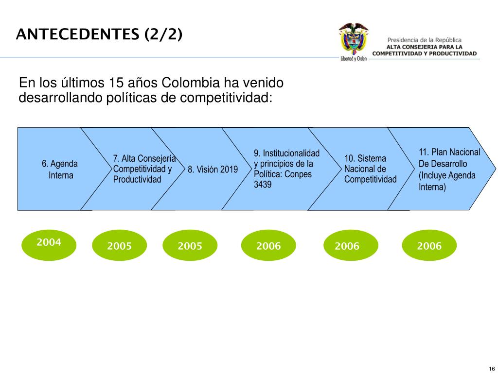ANTECEDENTES (2/2) En los últimos 15 años Colombia ha venido desarrollando políticas de competitividad: 6. Agenda Interna 11. Plan Nacional De Desarrollo (Incluye Agenda Interna) 9. Institucionalidad y principios de la Política: Conpes 3439 10. Sistema Nacional de Competitividad 7. Alta Consejería Competitividad y Productividad 8. Visión 2019 2004 2005 2005 2006 2006 2006
