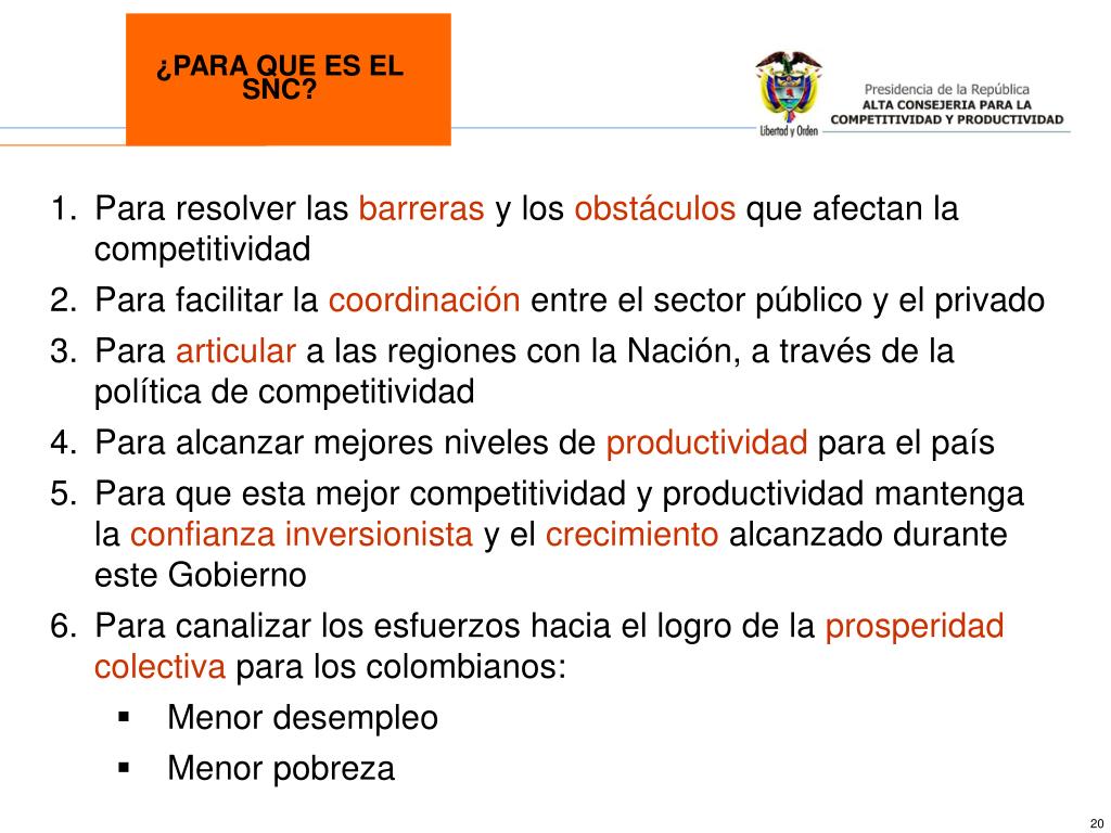 ¿PARA QUE ES EL SNC? • Para resolver las barreras y los obstáculos que afectan la competitividad • Para facilitar la coordinación entre el sector público y el privado • Para articular a las regiones con la Nación, a través de la política de competitividad • Para alcanzar mejores niveles de productividad para el país • Para que esta mejor competitividad y productividad mantenga la confianza inversionista y el crecimiento alcanzado durante este Gobierno • Para canalizar los esfuerzos hacia el logro de la prosperidad colectiva para los colombianos: • Menor desempleo • Menor pobreza