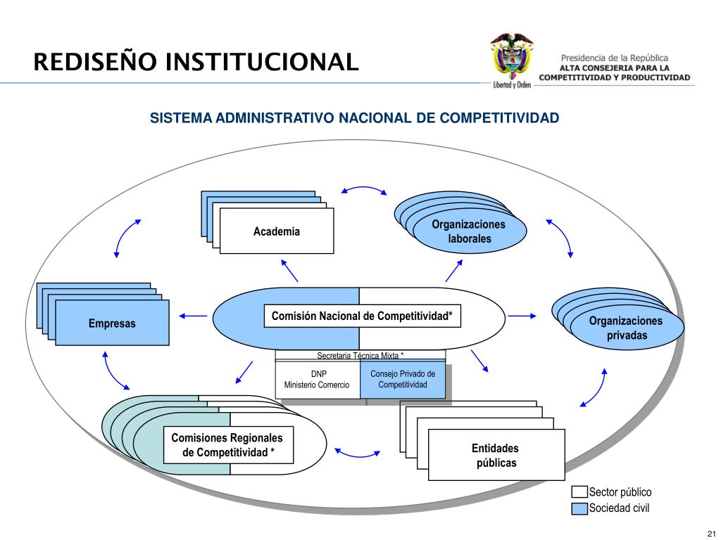 REDISEÑO INSTITUCIONAL SISTEMA ADMINISTRATIVO NACIONAL DE COMPETITIVIDAD Empresas Empresas Empresas Empresas Empresas Empresas Academia Organizaciones laborales Empresas Empresas Empresas Empresas Empresas Empresas Empresas Comisión Nacional de Competitividad* Organizaciones privadas Secretaria Técnica Mixta * Consejo Privado de Competitividad DNP Ministerio Comercio Entidades públicas Entidades públicas Comisiones Regionales de Competitividad Comisiones Regionales de Competitividad Entidades públicas Comisiones Regionales de Competitividad Comisiones Regionales de Competitividad * Entidades públicas Sector público Sociedad civil
