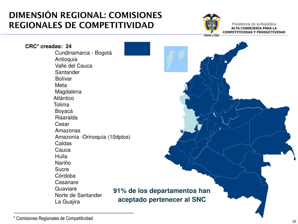 DIMENSIÓN REGIONAL:COMISIONES REGIONALES DE COMPETITIVIDAD CRC* creadas: 24 Cundinamarca - Bogotá Antioquia Valle del Cauca Santander Bolívar Meta Magdalena Atlántico Tolima Boyacá Risaralda Cesar Amazonas Amazonía -Orinoquía (10dptos) Caldas Cauca Huila Nariño Sucre Córdoba Casanare Guaviare Norte de Santander La Guajira 91% de los departamentos han aceptado pertenecer al SNC * Comisiones Regionales de Competitividad