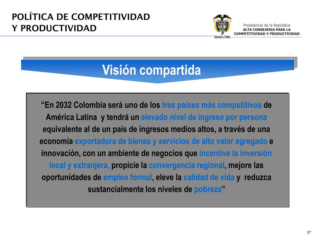POLÍTICA DE COMPETITIVIDADY PRODUCTIVIDAD Visión compartida “En 2032 Colombia será uno de los tres países más competitivos de América Latina y tendrá un elevado nivel de ingreso por persona equivalente al de un país de ingresos medios altos, a través de una economía exportadora de bienes y servicios de alto valor agregado e innovación, con un ambiente de negocios que incentive la inversiónlocal y extranjera, propicie la convergencia regional, mejore las oportunidades de empleo formal, eleve la calidad de vida y reduzca sustancialmente los niveles de pobreza”