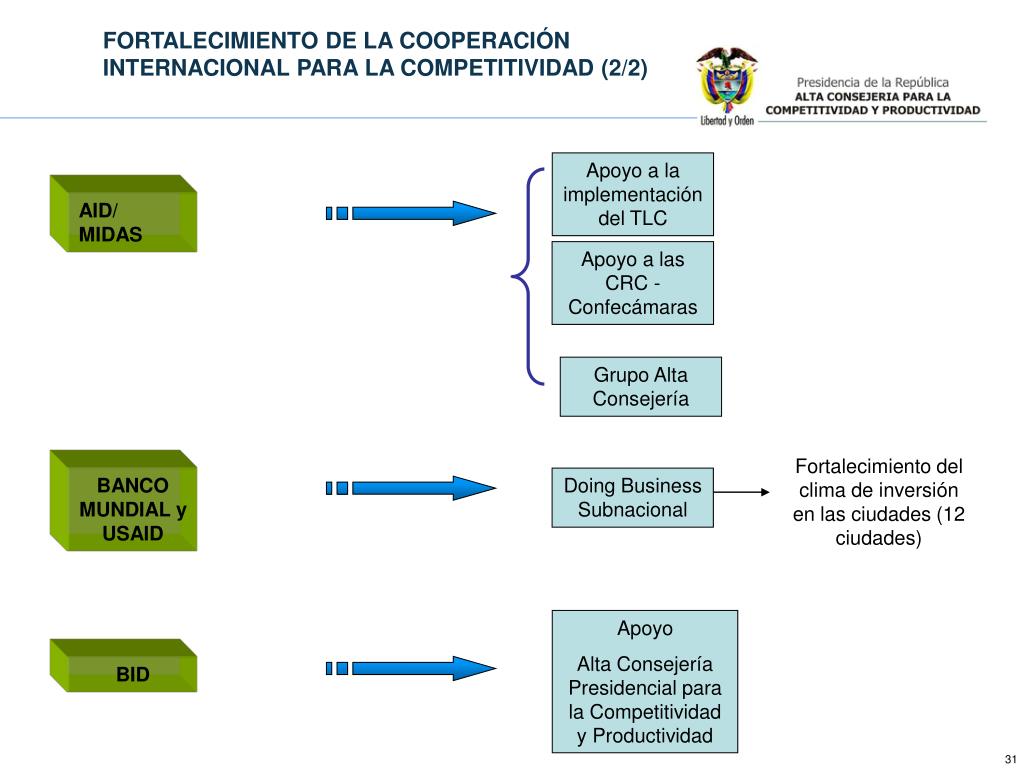 FORTALECIMIENTO DE LA COOPERACIÓN INTERNACIONAL PARA LA COMPETITIVIDAD (2/2) Apoyo a la implementación del TLC AID/ MIDAS Apoyo a las CRC - Confecámaras Grupo Alta Consejería Fortalecimiento del clima de inversión en las ciudades (12 ciudades) BANCO MUNDIAL y USAID Doing Business Subnacional Apoyo Alta Consejería Presidencial para la Competitividad y Productividad BID