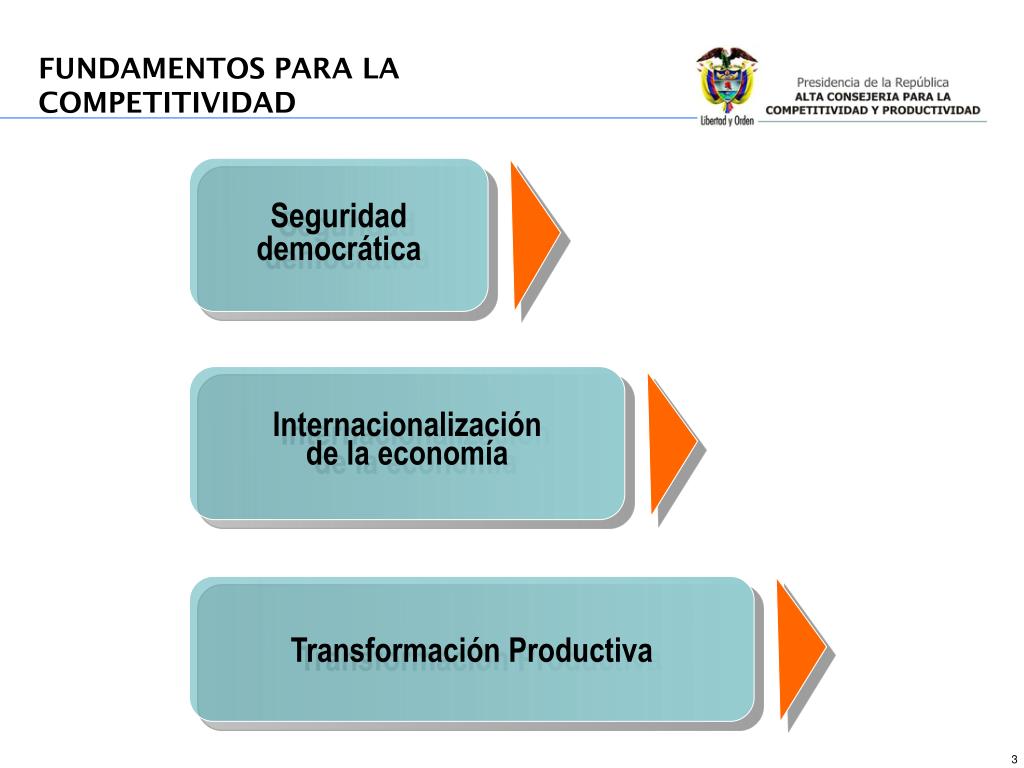 FUNDAMENTOS PARA LA COMPETITIVIDAD Seguridad democrática Internacionalización de la economía Transformación Productiva