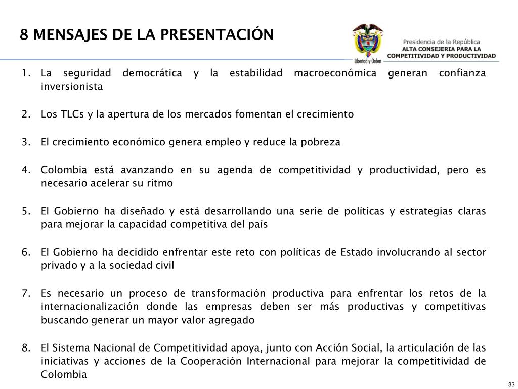 8 MENSAJES DE LA PRESENTACIÓN • La seguridad democrática y la estabilidad macroeconómica generan confianza inversionista • Los TLCs y la apertura de los mercados fomentan el crecimiento • El crecimiento económico genera empleo y reduce la pobreza • Colombia está avanzando en su agenda de competitividad y productividad, pero es necesario acelerar su ritmo • El Gobierno ha diseñado y está desarrollando una serie de políticas y estrategias claras para mejorar la capacidad competitiva del país • El Gobierno ha decidido enfrentar este reto con políticas de Estado involucrando al sector privado y a la sociedad civil • Es necesario un proceso de transformación productiva para enfrentar los retos de la internacionalización donde las empresas deben ser más productivas y competitivas buscando generar un mayor valor agregado • El Sistema Nacional de Competitividad apoya, junto con Acción Social, la articulación de las iniciativas y acciones de la Cooperación Internacional para mejorar la competitividad de Colombia