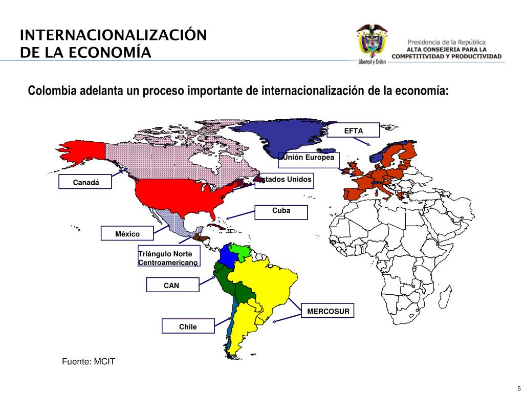 INTERNACIONALIZACIÓN DE LA ECONOMÍA Colombia adelanta un proceso importante de internacionalización de la economía: EFTA Unión Europea Estados Unidos Canadá Cuba México Triángulo Norte Centroamericano CAN MERCOSUR Chile Fuente: MCIT