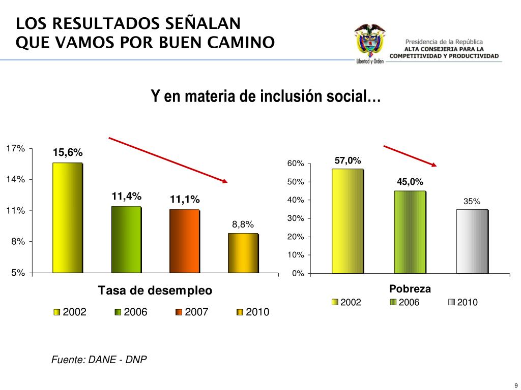 LOS RESULTADOS SEÑALAN QUE VAMOS POR BUEN CAMINO Y en materia de inclusión social… Fuente: DANE - DNP