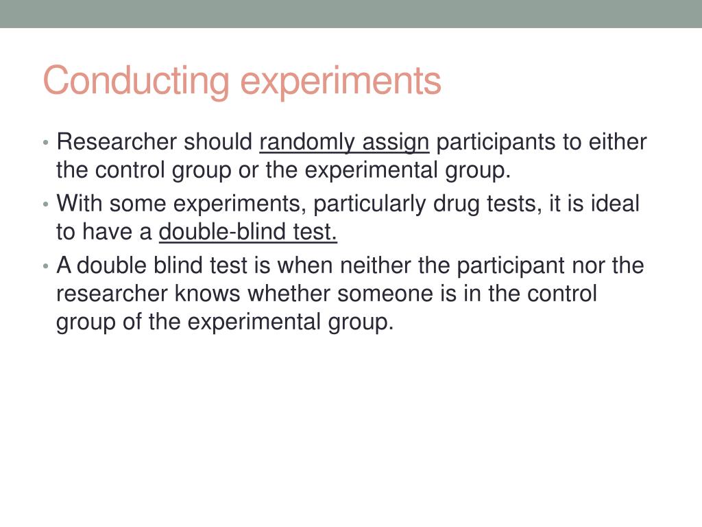 Conducting experiments • Researcher should randomly assign participants to either the control group or the experimental group. • With some experiments, particularly drug tests, it is ideal to have a double-blind test. • A double blind test is when neither the participant nor the researcher knows whether someone is in the control group of the experimental group.