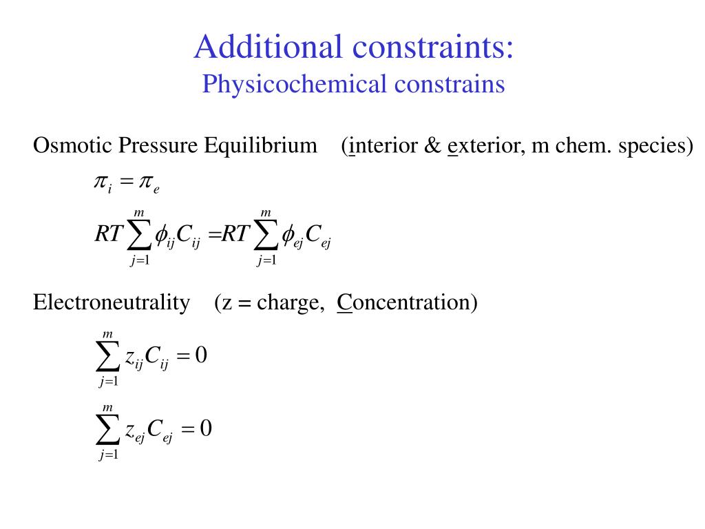 Additional constraints:Physicochemical constrains Osmotic Pressure Equilibrium (interior & exterior, m chem. species) Electroneutrality (z = charge, Concentration)
