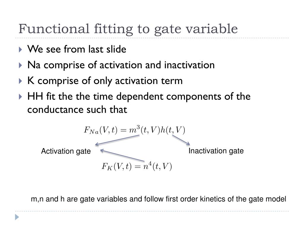Functional fitting to gate variable • We see from last slide • Na comprise of activation and inactivation • K comprise of only activation term • HH fit the the time dependent components of the conductance such that Inactivation gate Activation gate m,n and h are gate variables and follow first order kinetics of the gate model