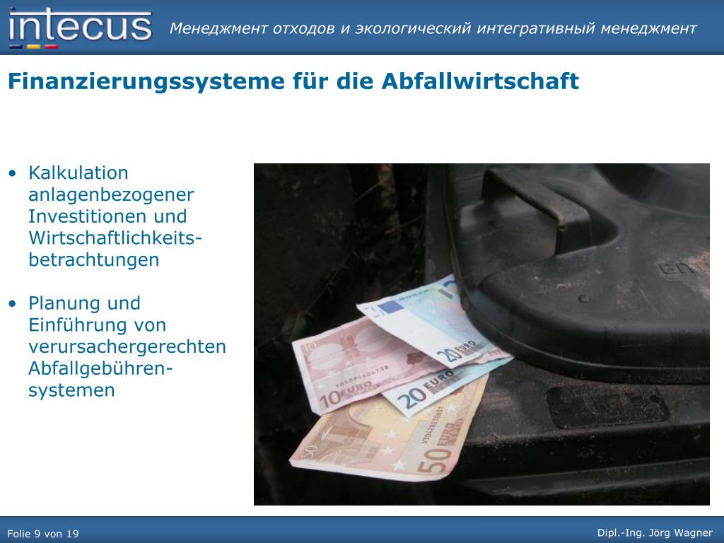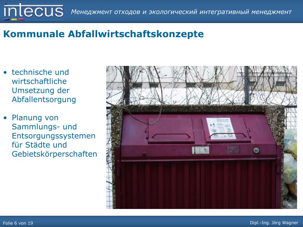 Vielen Dank für Ihre Aufmerksamkeit Dipl.-Ing. Jörg Wagner INTECUS GmbH Менеджмент отходов и экологический интегративный менеджмент Pohlandstr. 17D-01309 Dresden fon: +49 (351) 3182314fax: +49 (351) 3182333email: joerg.wagner@intecus.deinternet: www.intecus.de