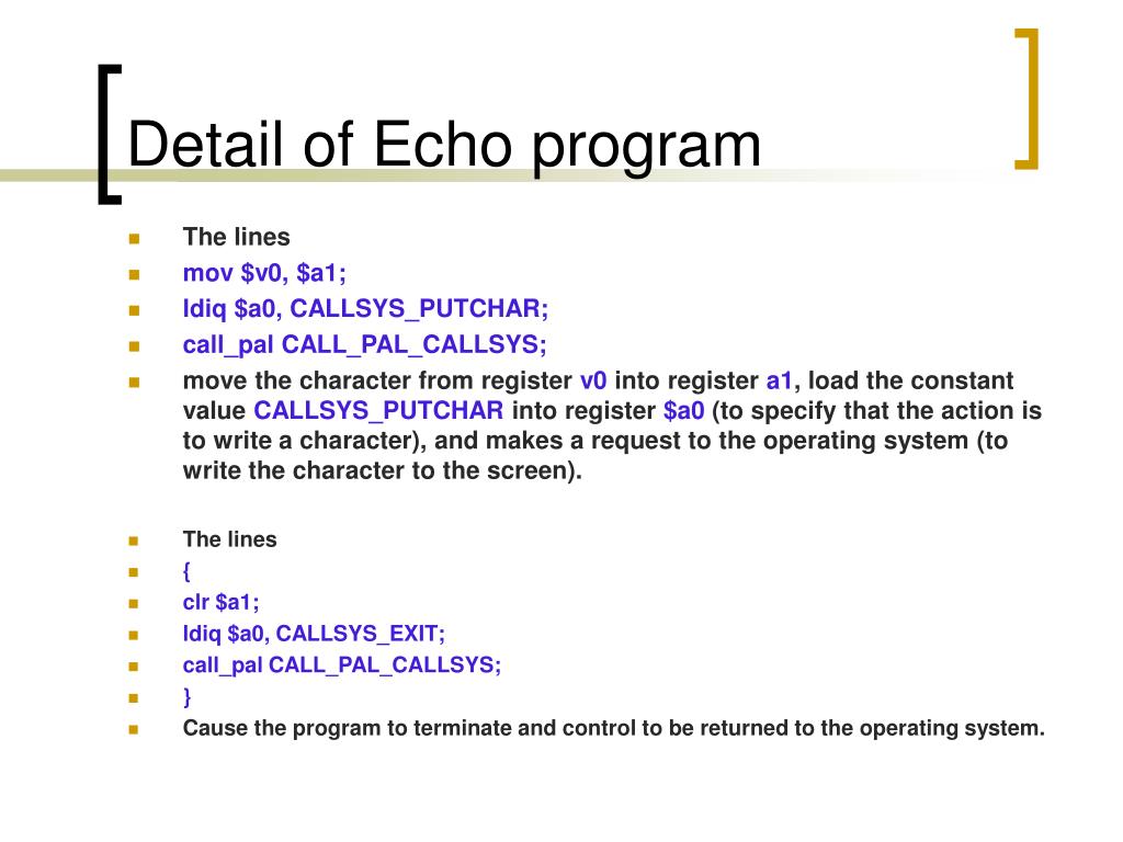 Detail of Echo program • The lines • mov $v0, $a1; • ldiq $a0, CALLSYS_PUTCHAR; • call_pal CALL_PAL_CALLSYS; • move the character from register v0 into register a1, load the constant value CALLSYS_PUTCHAR into register $a0 (to specify that the action is to write a character), and makes a request to the operating system (to write the character to the screen). • The lines • { • clr $a1; • ldiq $a0, CALLSYS_EXIT; • call_pal CALL_PAL_CALLSYS; • } • Cause the program to terminate and control to be returned to the operating system.