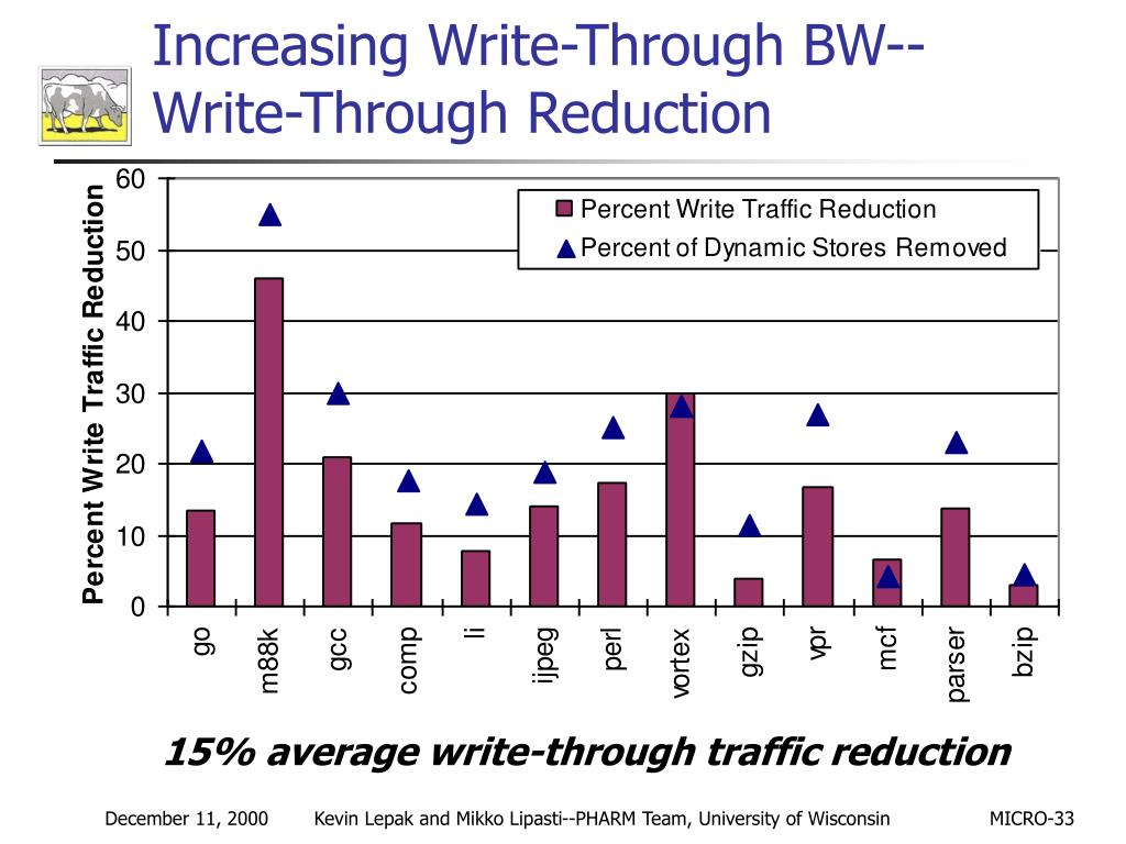 Increasing Write-Through BW--Write-Through Reduction 15% average write-through traffic reduction Kevin Lepak and Mikko Lipasti--PHARM Team, University of Wisconsin MICRO-33
