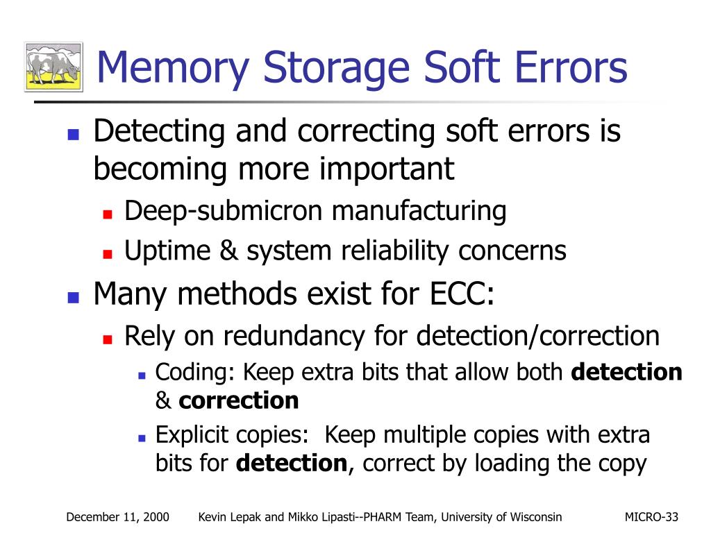 Memory Storage Soft Errors • Detecting and correcting soft errors is becoming more important • Deep-submicron manufacturing • Uptime & system reliability concerns • Many methods exist for ECC: • Rely on redundancy for detection/correction • Coding: Keep extra bits that allow both detection & correction • Explicit copies: Keep multiple copies with extra bits for detection, correct by loading the copy Kevin Lepak and Mikko Lipasti--PHARM Team, University of Wisconsin MICRO-33