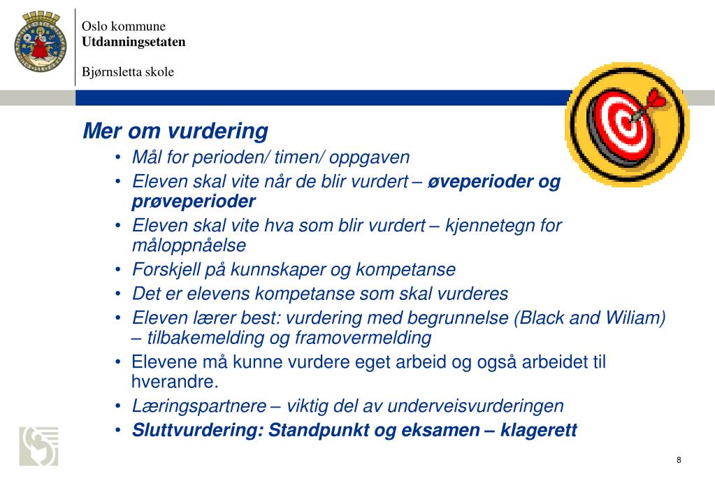 Brosjyre – vurdering på Bjørnsletta skole • Øveperioder – tester, oppgaver • Underveisvurdering - elevsamtaler • Midtveisvurdering – skriftlig vurdering/ Fronter • Utviklingssamtaler etter midtveisvurdering • Karakterer settes bare når vi vurderer elevens kompetanse! (15.januar og sommer) • Forskrift til opplæringsloven § 3 om vurdering Kun elever med individuell opplæringsplan eller med særskilt norskopplæring som kan fritas for vurdering med karakter i sidemål! • Opplæringsloven og Kunnskapsløftet - lenker på skolens hjemmeside (www.bjornsletta.gs.oslo.no/ Satsingsområder)