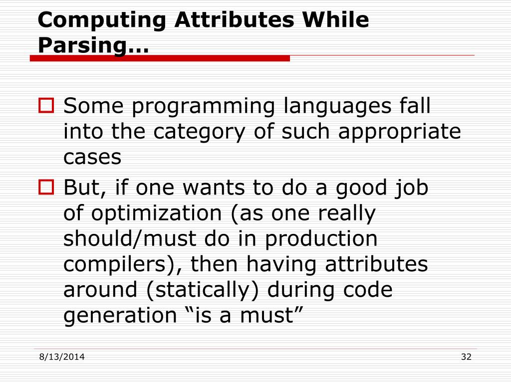 Computing Attributes While Parsing… • Some programming languages fall into the category of such appropriate cases • But, if one wants to do a good job of optimization (as one really should/must do in production compilers), then having attributes around (statically) during code generation “is a must”