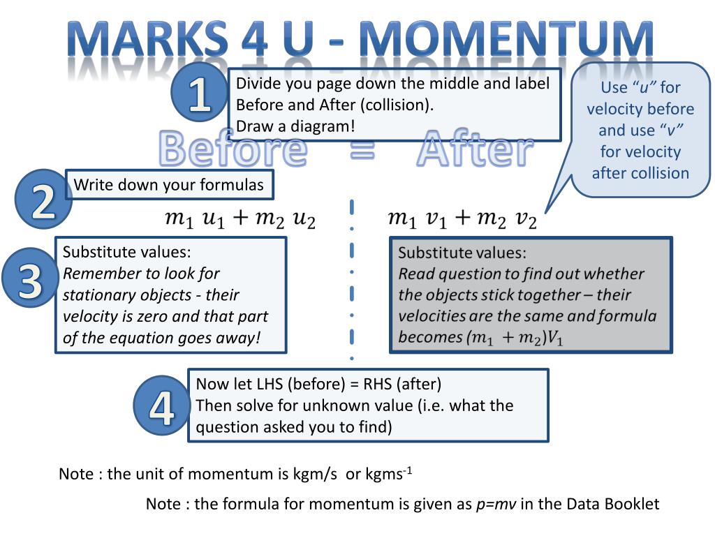 2 3 4 Marks 4 U - momentum 1 Use “u” for velocity before and use “v” for velocity after collision Divide you page down the middle and label Before and After (collision). Draw a diagram! Before = After Write down your formulas Substitute values: Remember to look for stationary objects - their velocity is zero and that part of the equation goes away! Now let LHS (before) = RHS (after) Then solve for unknown value (i.e. what the question asked you to find) Note : the unit of momentum is kgm/s or kgms-1 Note : the formula for momentum is given as p=mv in the Data Booklet