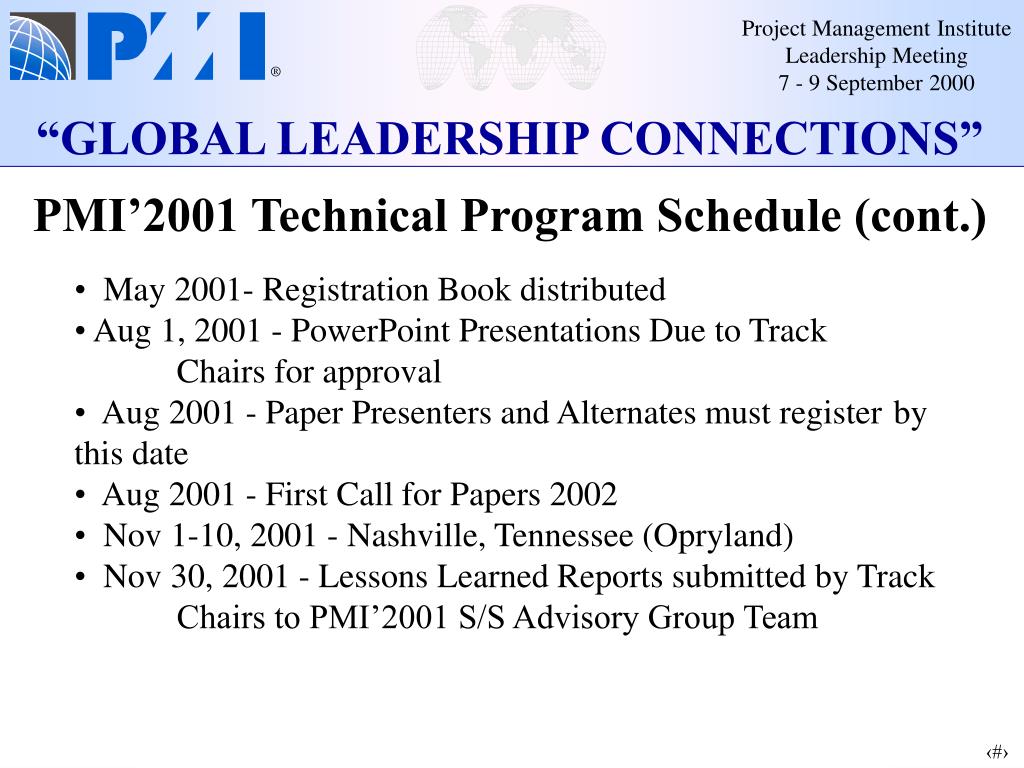 PMI’2001 Technical Program Schedule (cont.) COPY THIS SLIDE TO USE FOR ADDITIONAL SLIDES • May 2001- Registration Book distributed • Aug 1, 2001 - PowerPoint Presentations Due to Track Chairs for approval • Aug 2001 - Paper Presenters and Alternates must register by this date • Aug 2001 - First Call for Papers 2002 • Nov 1-10, 2001 - Nashville, Tennessee (Opryland) • Nov 30, 2001 - Lessons Learned Reports submitted by Track Chairs to PMI’2001 S/S Advisory Group Team