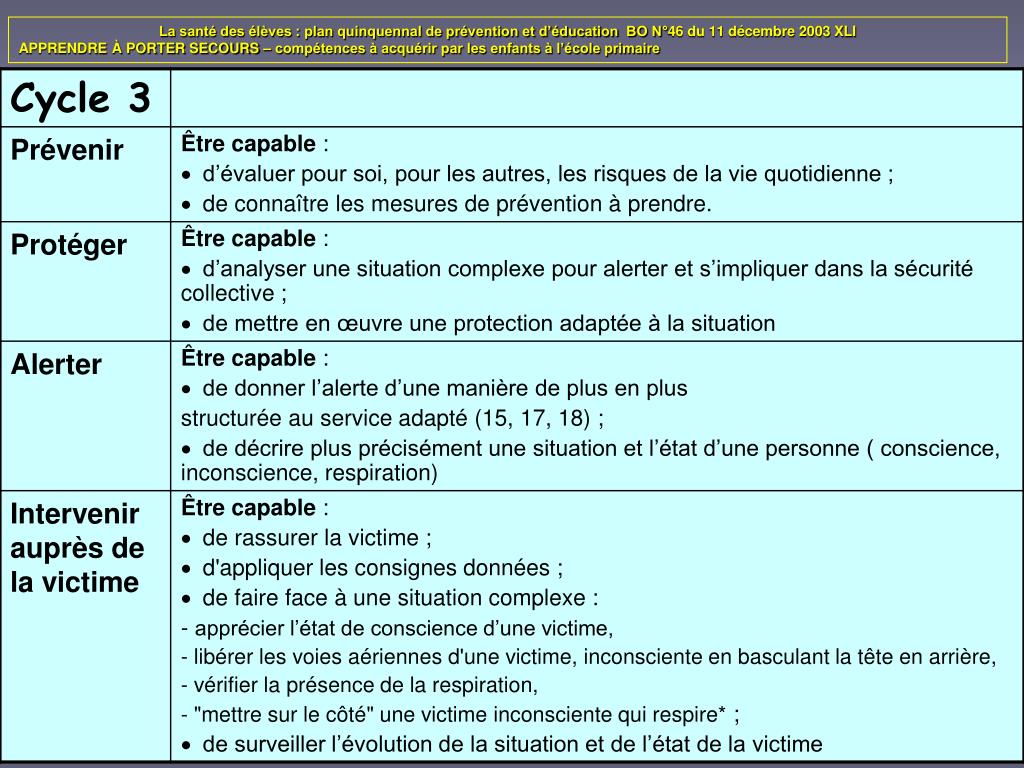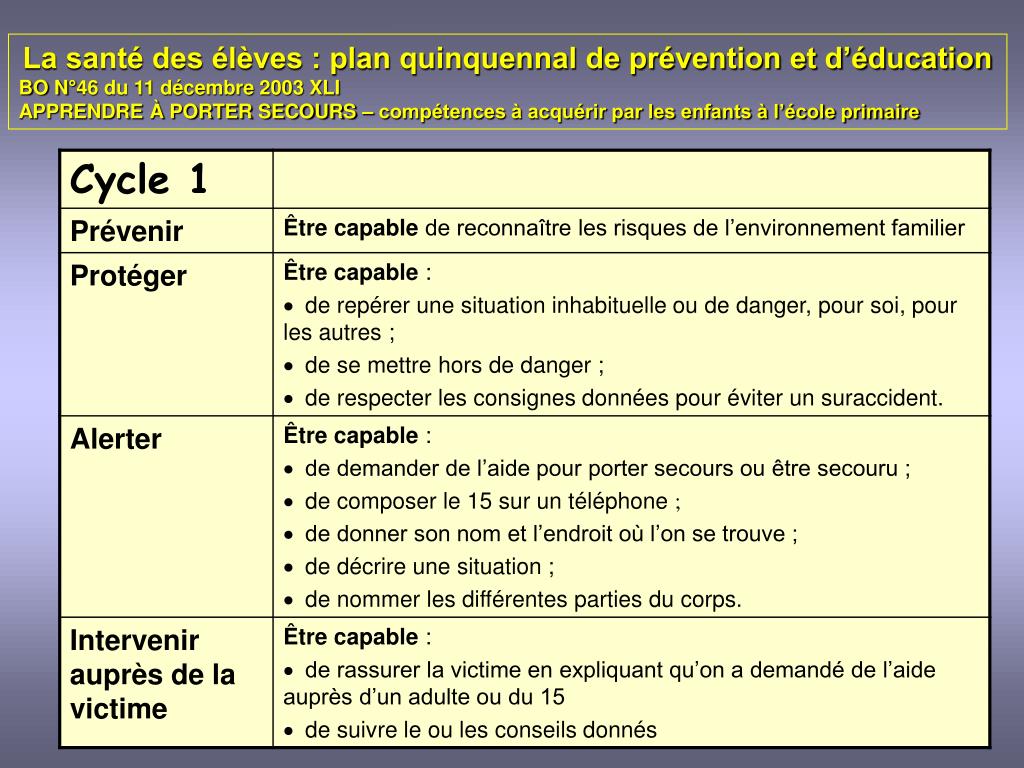 La santé des élèves : plan quinquennal de prévention et d’éducation BO N°46 du 11 décembre 2003 XLI APPRENDRE À PORTER SECOURS – compétences à acquérir par les enfants à l’école primaire