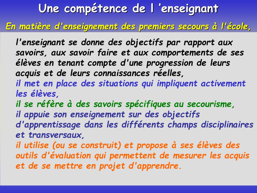 Une compétence de l ’enseignant En matière d'enseignement des premiers secours à l'école, • l'enseignant se donne des objectifs par rapport aux savoirs, aux savoir faire et aux comportements de ses élèves en tenant compte d'une progression de leurs acquis et de leurs connaissances réelles, • il met en place des situations qui impliquent activement les élèves, • il se réfère à des savoirs spécifiques au secourisme, • il appuie son enseignement sur des objectifs d'apprentissage dans les différents champs disciplinaires et transversaux, • il utilise (ou se construit) et propose à ses élèves des outils d'évaluation qui permettent de mesurer les acquis et de se mettre en projet d'apprendre.
