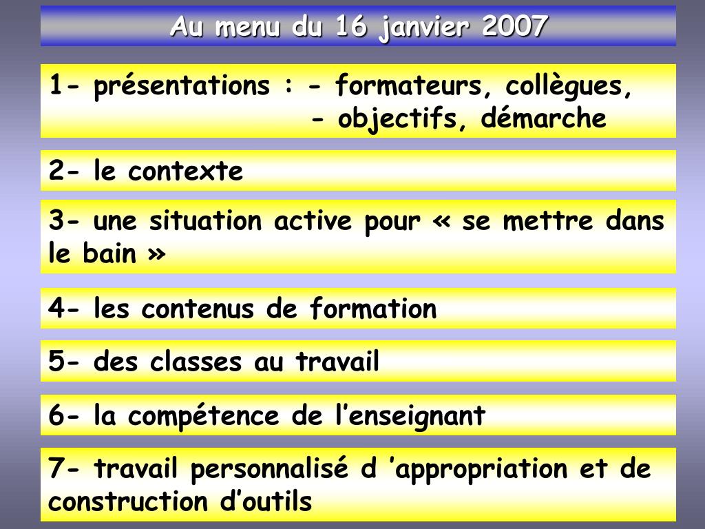 Au menu du 16 janvier 2007 1- présentations : - formateurs, collègues, - objectifs, démarche 2- le contexte 3- une situation active pour « se mettre dans le bain » 4- les contenus de formation 5- des classes au travail 6- la compétence de l’enseignant 7- travail personnalisé d ’appropriation et de construction d’outils