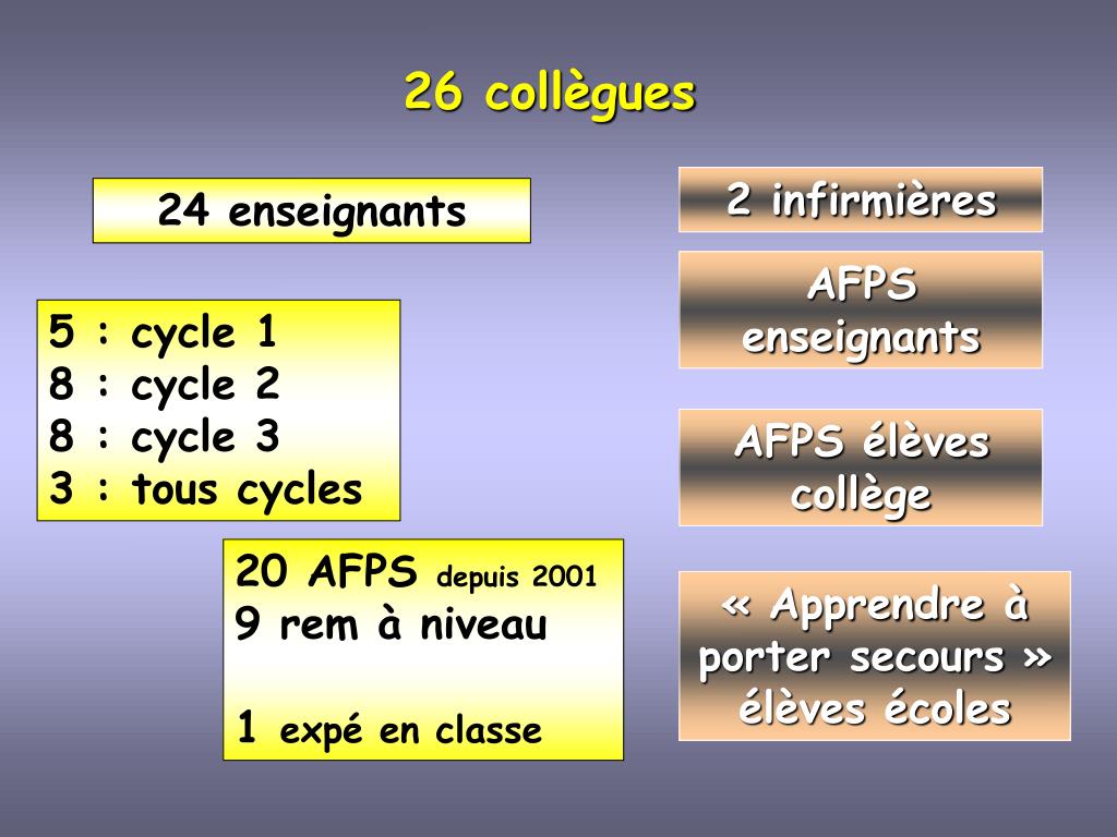 26 collègues 2 infirmières 24 enseignants AFPS enseignants 5 : cycle 1 8 : cycle 2 8 : cycle 3 3 : tous cycles AFPS élèves collège 20 AFPS depuis 2001 9 rem à niveau 1 expé en classe « Apprendre à porter secours » élèves écoles