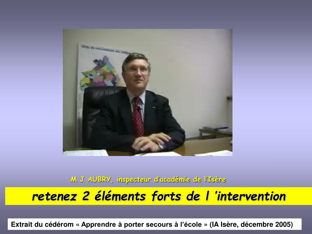 M J AUBRY, inspecteur d’académie de l’Isère retenez 2 éléments forts de l ’intervention Extrait du cédérom « Apprendre à porter secours à l’école » (IA Isère, décembre 2005)