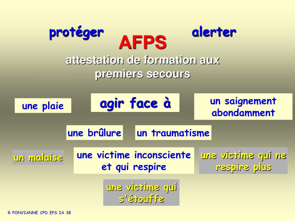 protéger alerter AFPS attestation de formation aux premiers secours agir face à un saignement abondamment une plaie une brûlure un traumatisme une victime inconsciente et qui respire une victime qui ne respire plus un malaise une victime qui s'étouffe R PONVIANNE CPD EPS IA 38