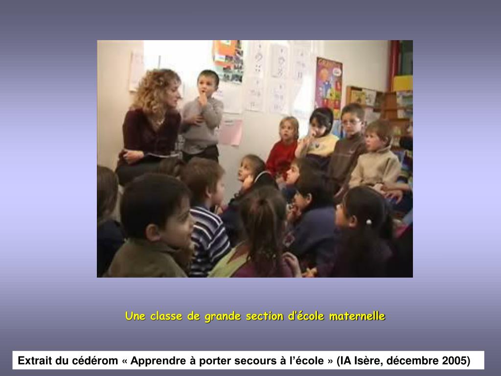 Une classe de grande section d’école maternelle Extrait du cédérom « Apprendre à porter secours à l’école » (IA Isère, décembre 2005)