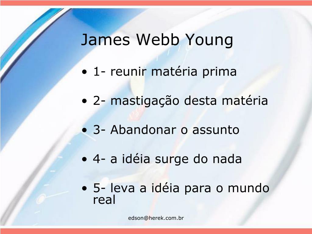 James Webb Young • 1- reunir matéria prima • 2- mastigação desta matéria • 3- Abandonar o assunto • 4- a idéia surge do nada • 5- leva a idéia para o mundo real edson@herek.com.br