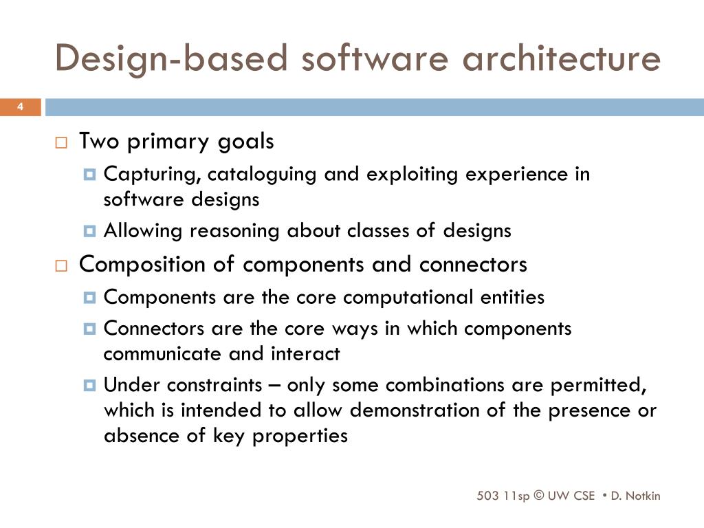 Design-based software architecture • Two primary goals • Capturing, cataloguing and exploiting experience in software designs • Allowing reasoning about classes of designs • Composition of components and connectors • Components are the core computational entities • Connectors are the core ways in which components communicate and interact • Under constraints – only some combinations are permitted, which is intended to allow demonstration of the presence or absence of key properties