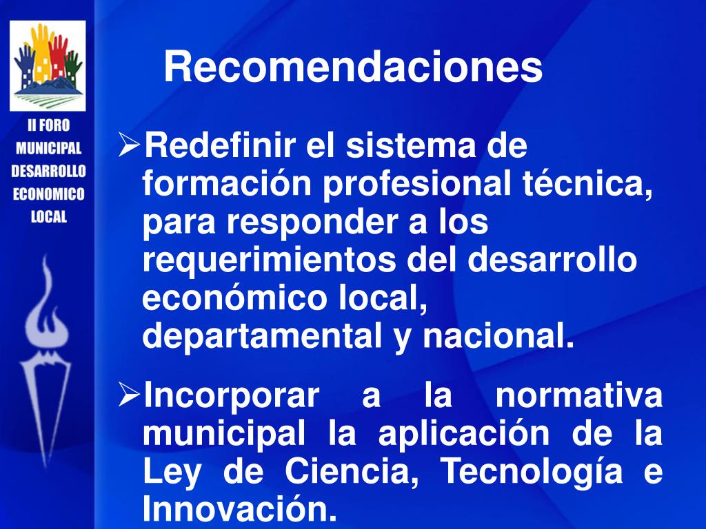 Recomendaciones • Redefinir el sistema de formación profesional técnica, para responder a los requerimientos del desarrollo económico local, departamental y nacional. • Incorporar a la normativa municipal la aplicación de la Ley de Ciencia, Tecnología e Innovación.