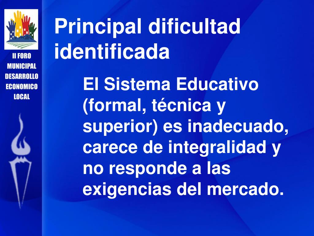 Principal dificultad identificada El Sistema Educativo (formal, técnica y superior) es inadecuado, carece de integralidad y no responde a las exigencias del mercado.