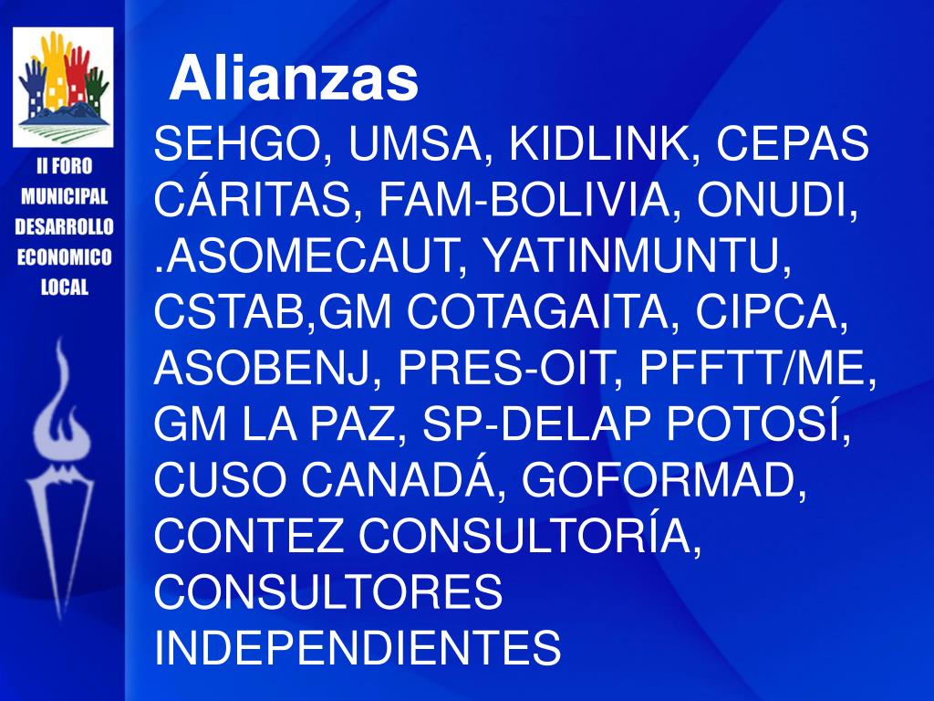 Alianzas SEHGO, UMSA, KIDLINK, CEPAS CÁRITAS, FAM-BOLIVIA, ONUDI, .ASOMECAUT, YATINMUNTU, CSTAB,GM COTAGAITA, CIPCA, ASOBENJ, PRES-OIT, PFFTT/ME, GM LA PAZ, SP-DELAP POTOSÍ, CUSO CANADÁ, GOFORMAD, CONTEZ CONSULTORÍA, CONSULTORES INDEPENDIENTES